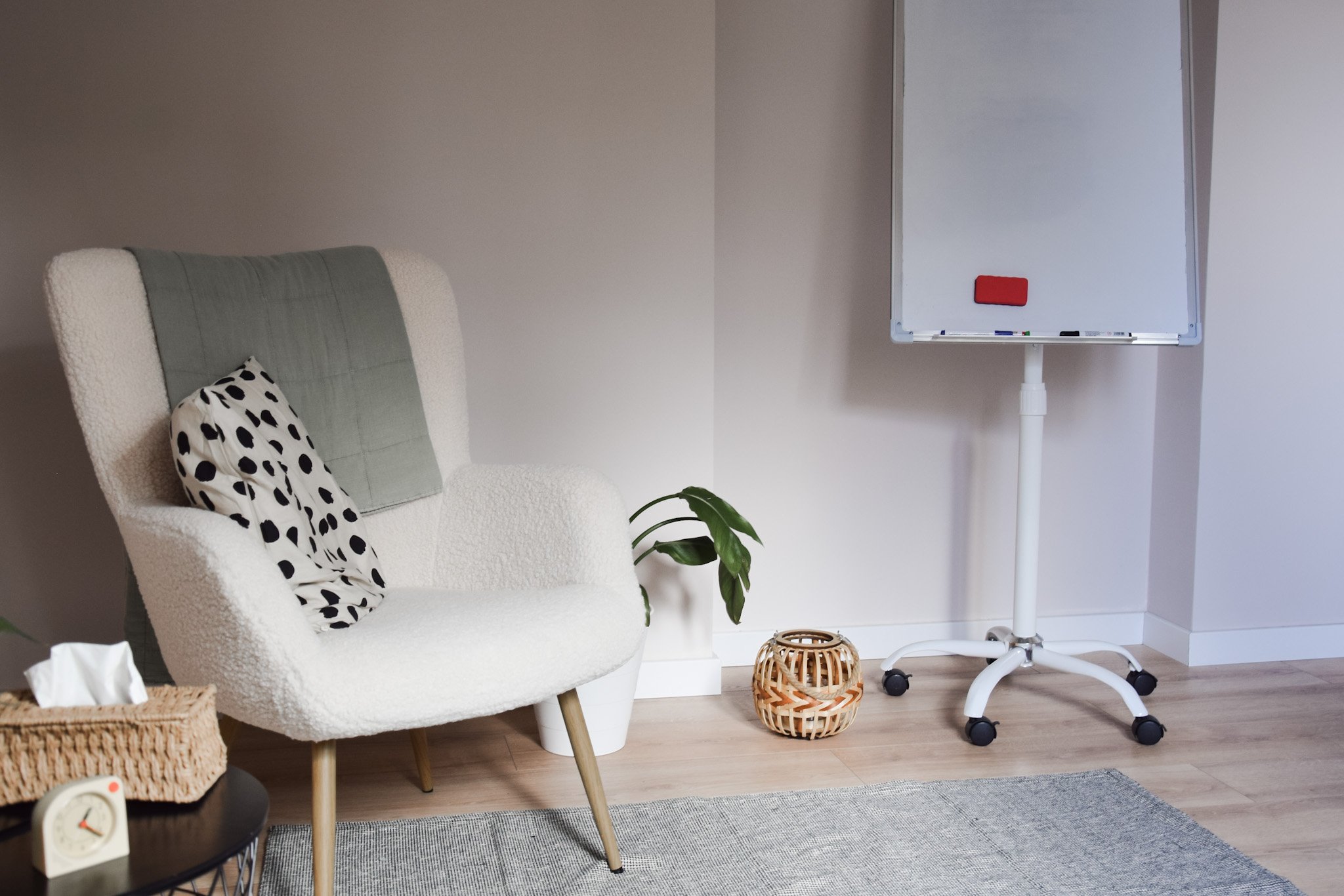 Znajdziesz w nim wszystko co potrzebne do komfortowej pracy. Wygodne fotele, kocyk, chusteczki na trudniejsze momenty, flipchart, szafkę na notatki, szybkie Wi-Fi. Jest oczywiście toaleta i kuchnia z lodówką, mikrofalą i ekspresem do kawy (mamy też roślinne mleko!).